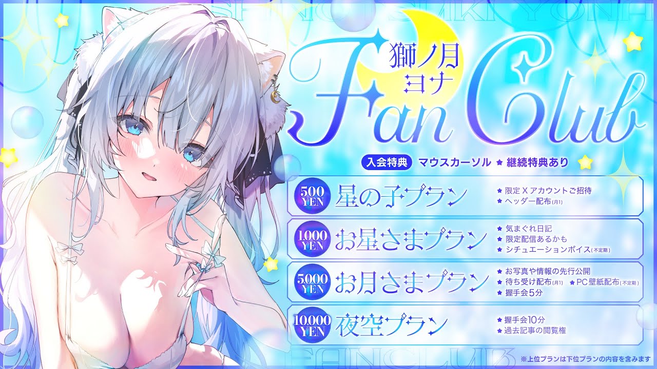 あなたを照らす夜の王様になりたい✨ ちょっぴり寂しがりやなホワイトライオン獅ノ月ヨナです! お仕事や案件のご案内などは、こちらにご連絡ください。 shinotuki.official@gmail.com - - - - - - - - - - - - - - - - - - - - ໒꒱·̩͙ Fan mark┊︎🤍🐾 Fan name┊︎星の子 総合┊︎#獅ノ月ヨナ 配信┊︎#よなすとりーむ スケジュール┊︎#がおがお予定 お知らせ┊︎#ヨナ通信 FA┊︎#獅ノ月絵 🤍X(Twitter) https://twitter.com/shinotsuki_yona 🤍HP┊︎FAや切抜きの規約・タグなど https://lit.link/shinotsukiyona 💗FANBOX💗ヘッダー配布やイラスト先行公開! https://shinotsuki-yona.fanbox.cc/ 🤍グッズ販売 https://shinotsukiyona.booth.pm/ - - - - - - - - - - - - - - - - - - - - Illustrator┊︎麦うさぎ様 @Siriusagimugi Live2D┊︎雲波なみ様 @kumonami_nami Logo・Screen Design┊︎僵尸パア様 @paa_vtuber Transition┊︎ファッションセンター(ゑ)様 @RadioWaveDOLL ED Illustrator┊︎ぱるふぇいと様 @parfait_fate Membership┊︎まめぴ様 @krmmjj2 |