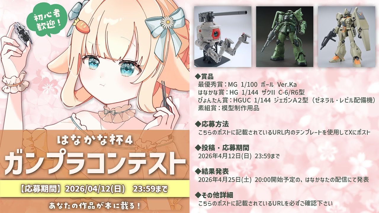 ガンダム・プラモデルがだいすきな光の戦士です ☻︎ ┈┈┈┈┈┈┈┈┈┈ ♡ ガンプラ┊プラモデル配信 平日は7:00、12:00、19:00の3回固定 土日は不定期に配信しています .ᐟ 朝 活 ┊ 平日 7:00 ~ 昼 活 ┊ 平日 12:00 ~ 13:00 夜 活 ┊ 平日 19:00 ~ ♡ ビルダーズノート https://www.gn-app.com/profile/TulJFP3EcpYJUDXhMoKHHCTLreO2 ♡ GUNSTA https://gumpla.jp/author/Hanakanata ┈┈┈┈┈┈┈┈┈┈ ♡ 規約やLinkなど HP ┊ https://lit.link/hanakanata ┈┈┈┈┈┈┈┈┈┈ 一部のゲームはTwitchで配信しています ☻︎ ⇩ Twitch ⇩ https://www.twitch.tv/hnkn_ouo ┈┈┈┈┈┈┈┈┈┈ ♡ X / Twitter https://x.com/hnkn_ouo ♡ 配信タグ #はなかならいぶ で呟いてね .ᐟ ✉ ♡ 鑑賞会用タグ 毎月、月末にみんなのプラモ鑑賞会をしています ☻︎ #プラいも王国 で呟いてね .ᐟ ┈┈┈┈┈┈┈┈┈┈ ♡ ファンクラブ ここだけの写真やブログ、限定配信や1on1、プレゼント企画など ❤︎ https://raidori.com/@hnkn_ouo ♡ Amazonほしいものリスト https://www.amazon.jp/hz/wishlist/ls/3HPYEYHYSMOT3?ref_=wl_share ♡ Gipt Wishlist(ほしいものリスト)サービス ☻︎ https://x.gd/P2D9O ♡ Doneru 少ない手数料でスパチャができるサービス ❤︎ https://doneru.jp/hnknouo ♡ ファンレター、プレゼントetc. 〒152-0035 東京都目黒区自由が丘2-16-12 RJ3 はなかなた宛 ┈┈┈┈┈┈┈┈┈┈ ꒰ Discordファンサーバー ꒱ 以下のURLよりご参加ください ☻︎ https://discord.gg/33mqGGEg |